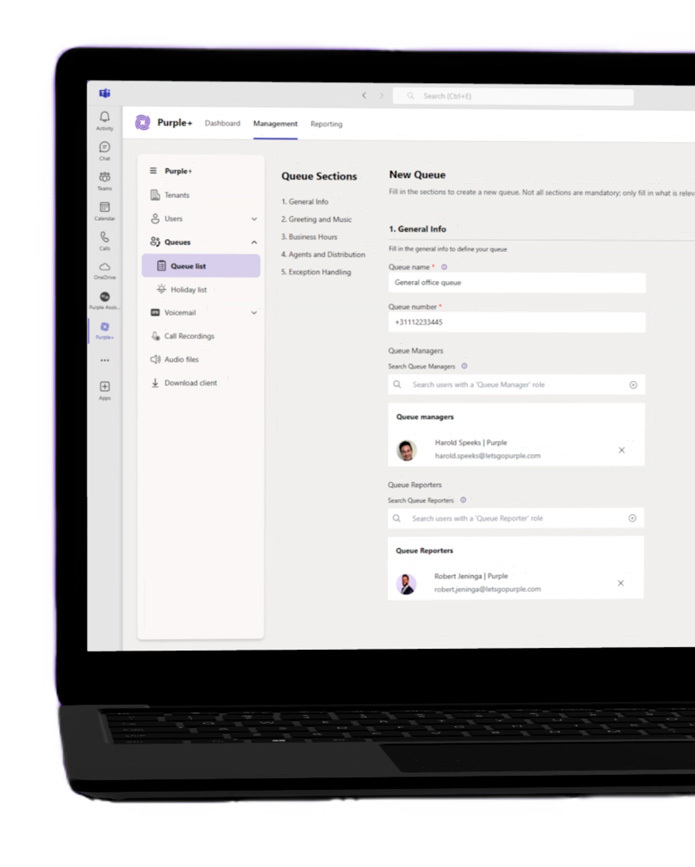 Purple+ is het eerste contactcenterplatform ter wereld dat volledig is ontwikkeld op Azure Communication Services en daarmee direct gebouwd op de Microsoft Teams architectuur.